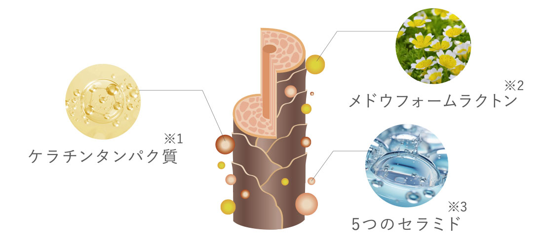 ※1 イソステアロイル加水分解ケラチン(羊毛)(毛髪補修成分) ※2 メドウフォーム-δ-ラクトン(保湿成分) ※3 セラミドAP、セラミドNP、セラミドNG、セラミドAG、セラミドEOP(すべて保湿成分)