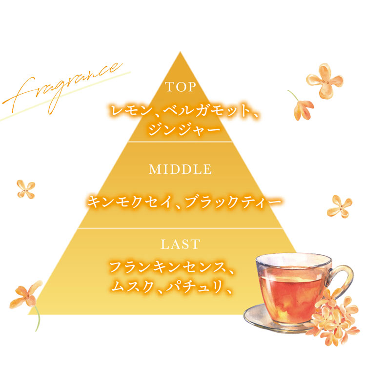 トップノートは柑橘のクリアなレモンとベルガモットが、ピリッとしたジンジャーと溶け合い、洗い⽴ての髪にシャープなエッジを与えます。ミドルノートは秋の⾵にほのかに揺れる⾦⽊犀の⽢美さに、上質なブラックティーの渋みが加わり、モダンかつノーブルな存在感を演出。ラストノートは深遠なフランキンセンスがスモーキーに⾹り、柔らかなムスクとアーシーなパチュリが温かく包み込む、⻑く続く余韻で⼼もやわらぎます。